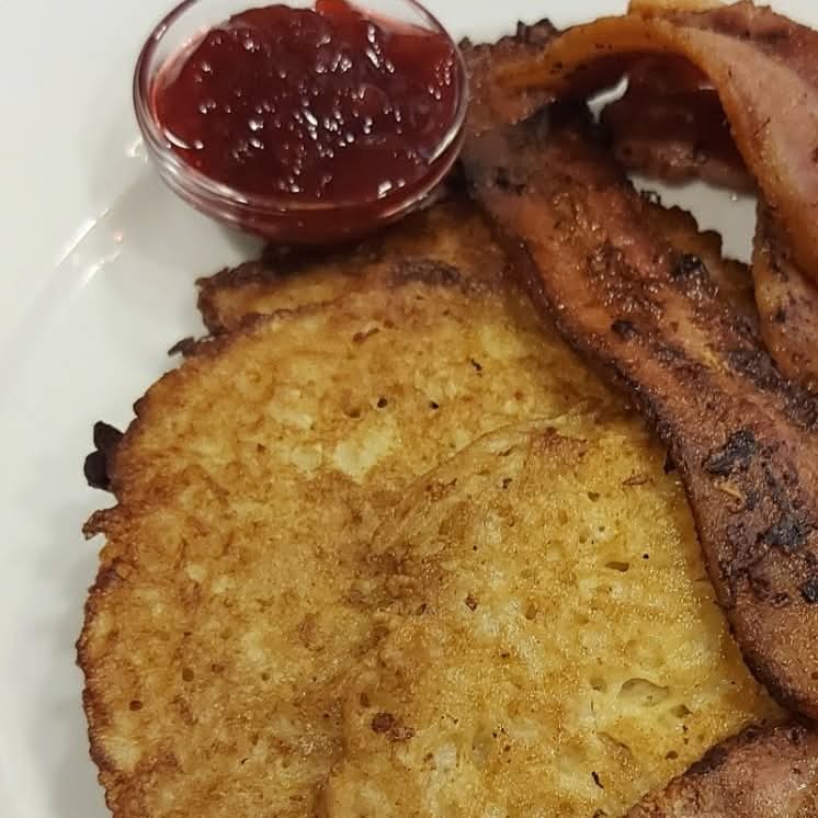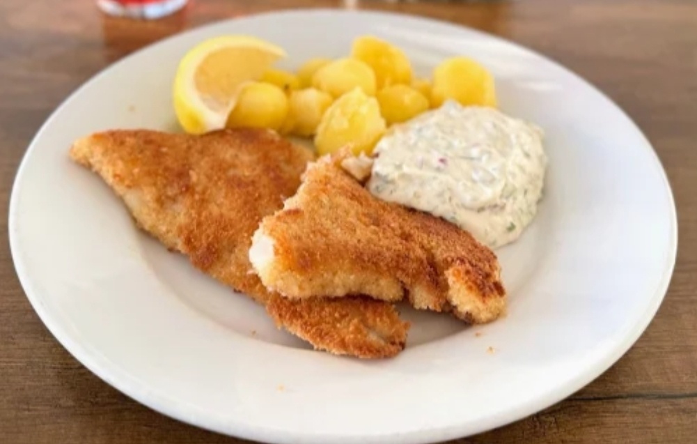Panerad fläskschnitzel med stekt potatis och rödvinssås, anjovisröra