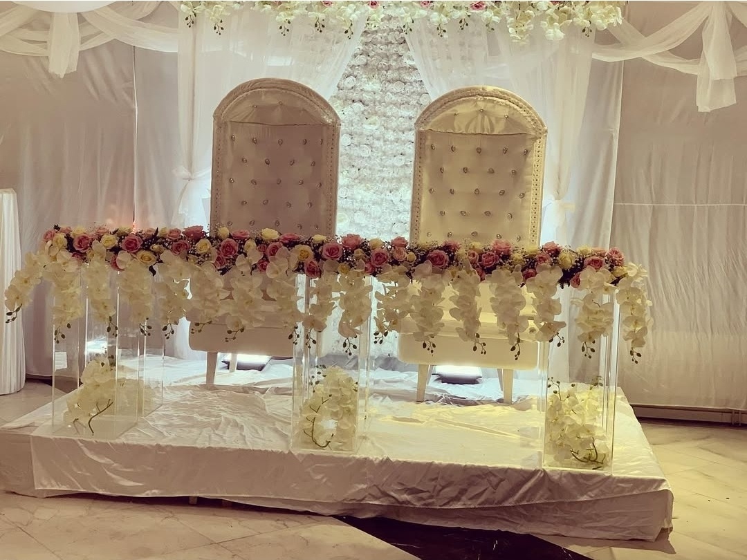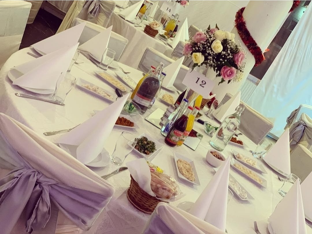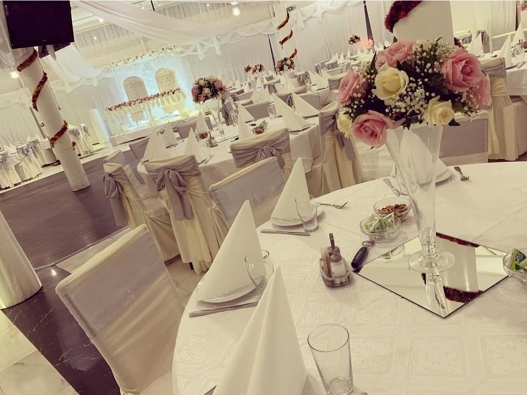 Elegant bröllopsdukning i sofistikerade silver- och vittoner. Runda bord med exklusiva dukar, stilrena stolsöverdrag med silverfärgade rosetter och noggrant utvalda detaljer skapar en lyxig och sammanhållen helhet. Mjuka ljussättningar och blomsterarrangemang i ljusa nyanser ger rummet en exklusiv känsla – perfekt för ett bröllop med modern elegans och tidlös stil.