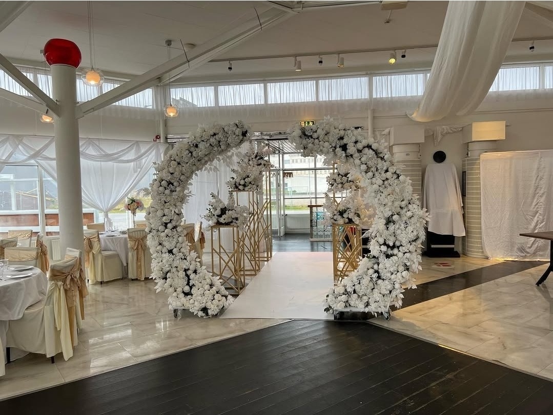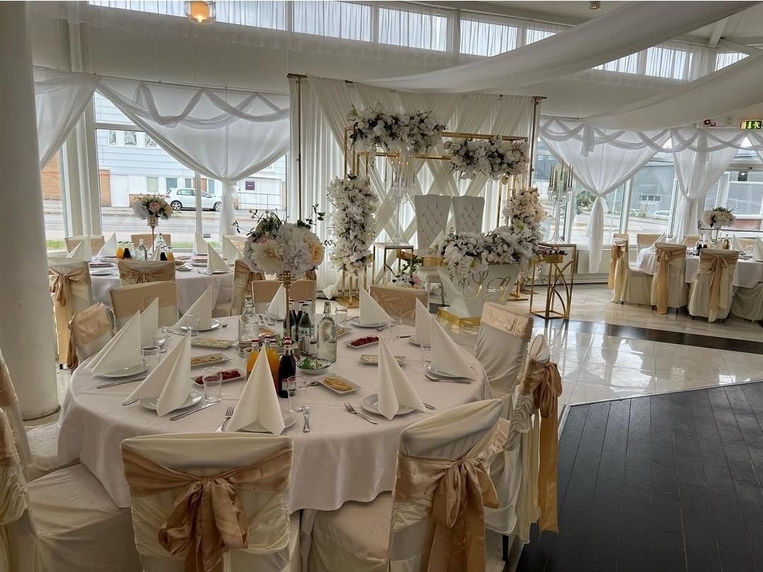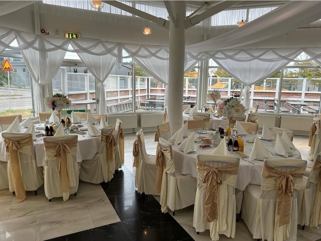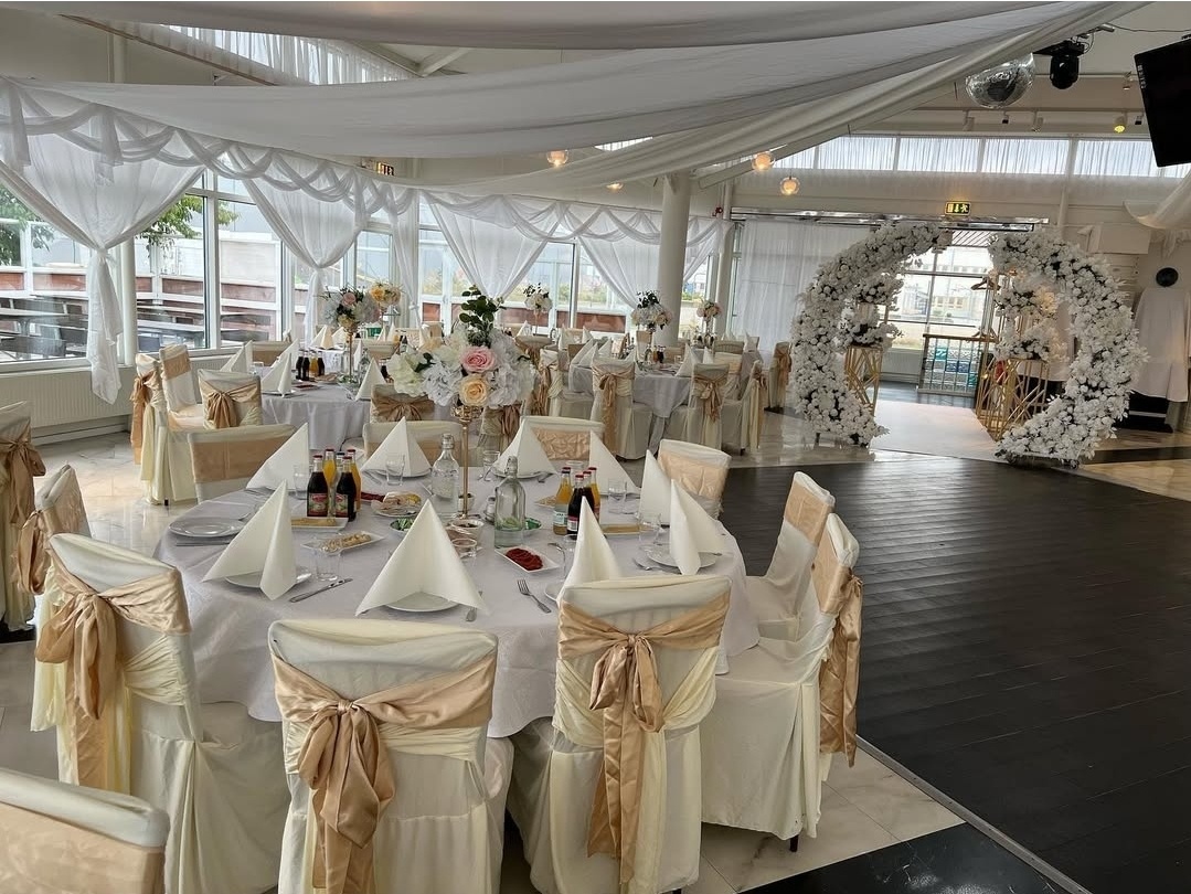 Ett hav av vitt, champagne och guld där mjuka tyger svävar från taket och sidenrosetter omfamnar varje stol. Eleganta dukningar, gnistrande detaljer och blomster i full blom skapar en drömlik och tidlös atmosfär – en exklusiv inramning för kärlekens största ögonblick.