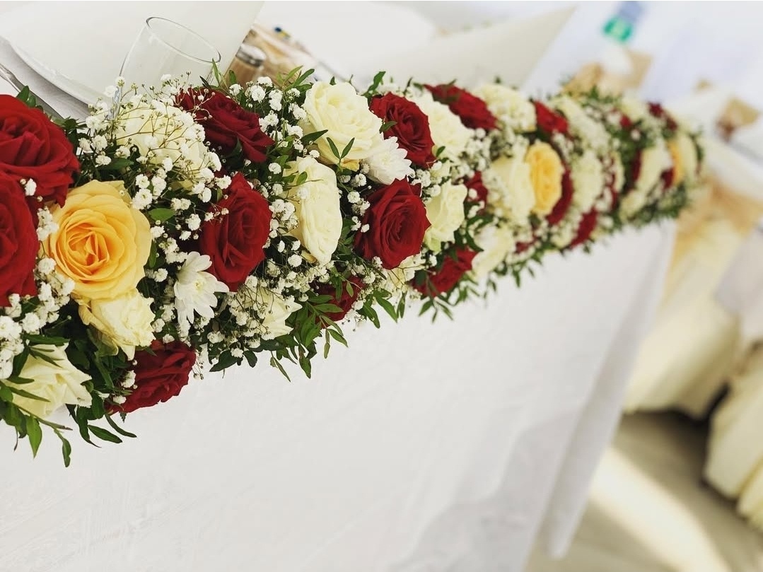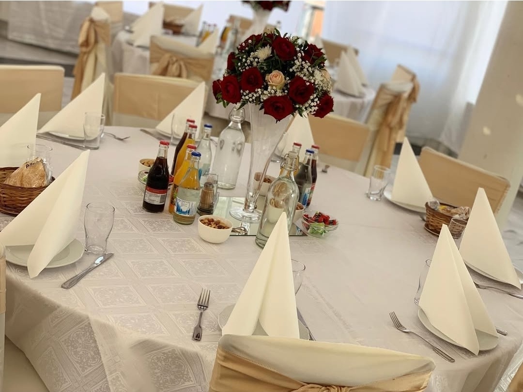 Elegant bröllopsdukning i vitt och champagne med runda bord och vinröda detaljer, stilrena servetter, matchande stolsöverdrag och blomsterarrangemang i vinrött och crème. En genomarbetad helhetslösning som skapar en exklusiv och inbjudande festmiljö för ert bröllop.