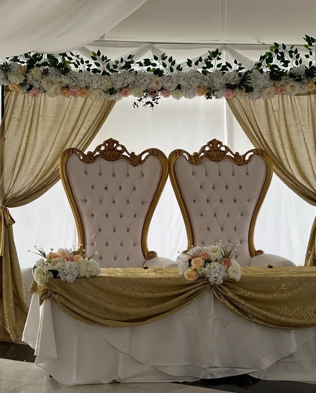 Elegant bröllopsdukning i toner av vitt, champagne och guld. Mjuka stolsrosetter i siden, krispiga linneservetter, gnistrande glas och höga blomsterarrangemang i vitt skapar en romantisk och tidlös känsla – perfekt för ett oförglömligt bröllop.