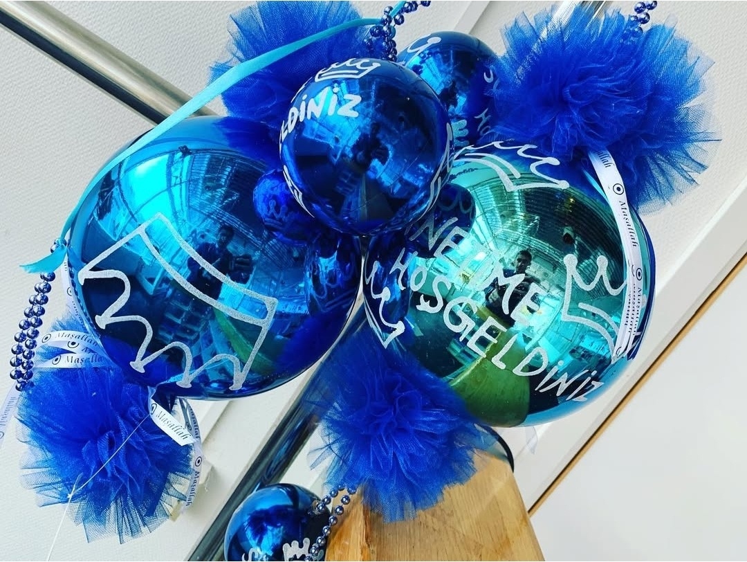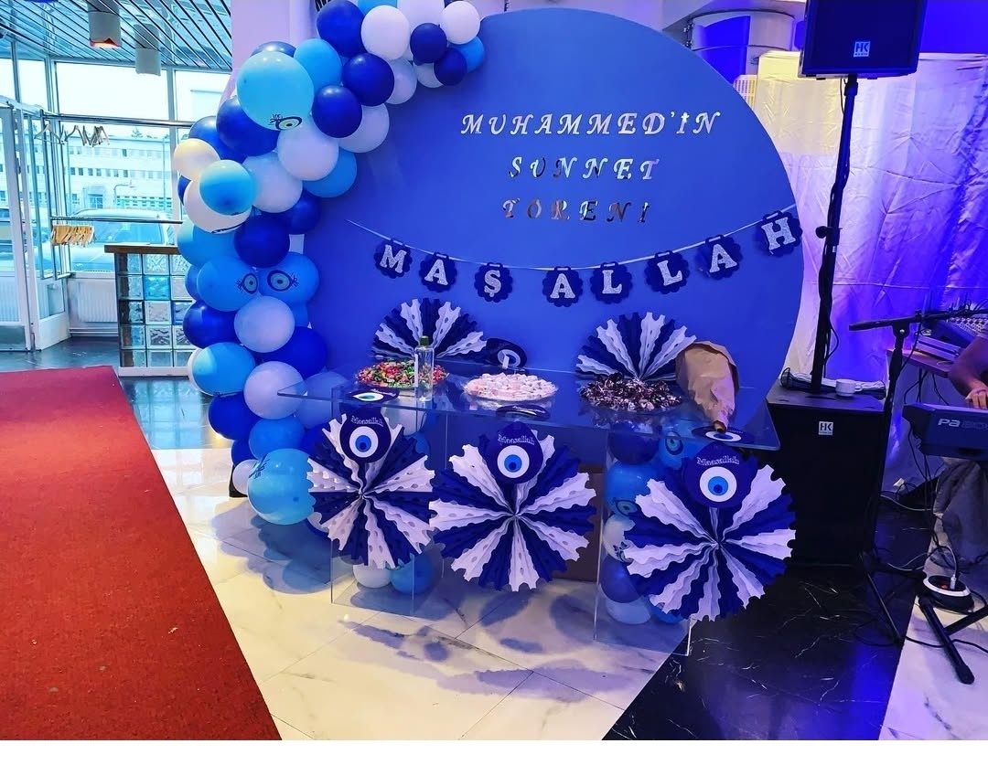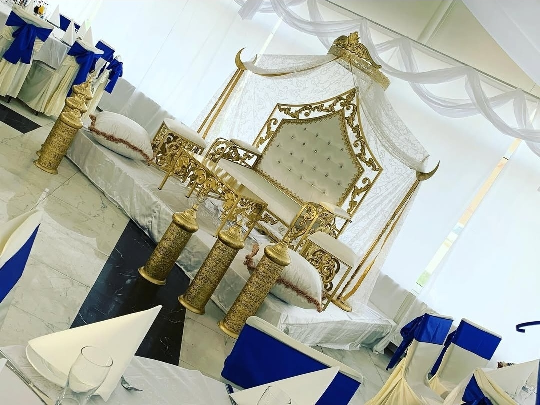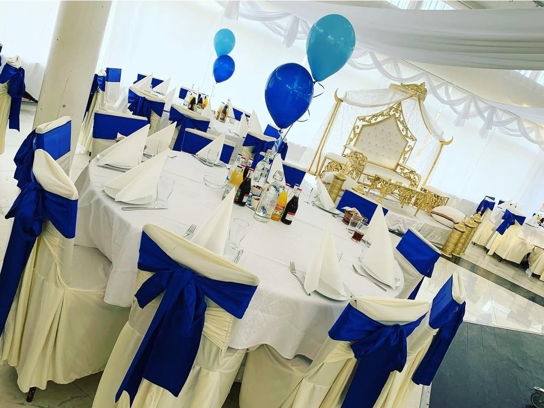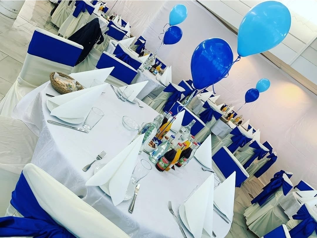 En elegant dukning i vitt och djupblå toner skapar en exklusiv och högtidlig atmosfär. De kraftiga blå stolsrosetterna, stilrena servetterna och de matchande ballongerna ger en sammanhållen helhet, medan den gulddetaljerade tronen tillför en kunglig känsla som gör firandet storslaget och minnesvärt.