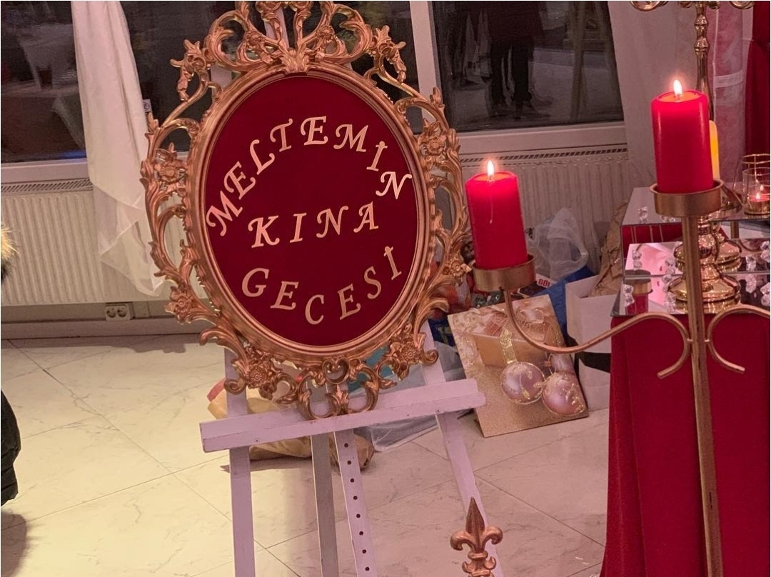 En klassisk och tidlös dukning i vitt och rött skapar en varm och festlig atmosfär. De djupröda stolsrosetterna, prydligt vikta servetter och blomsterarrangemang i matchande toner ger en harmonisk och exklusiv helhet – perfekt för ett högtidligt och minnesvärt henna firande.