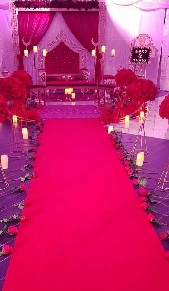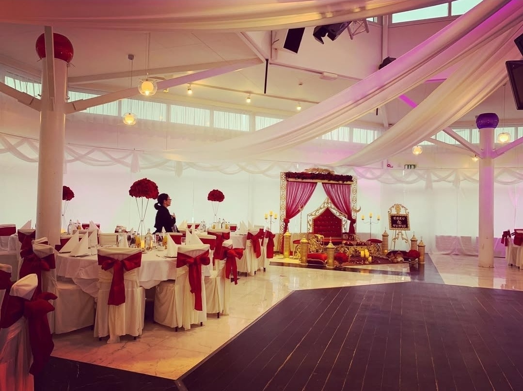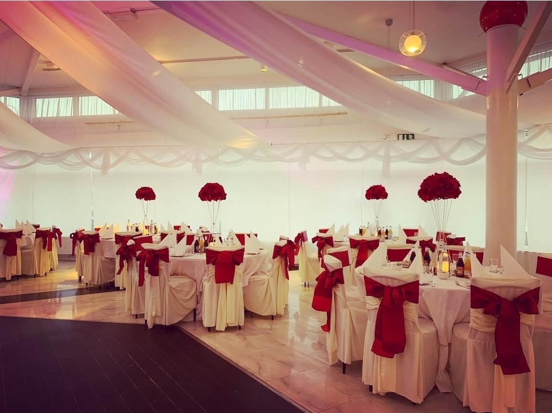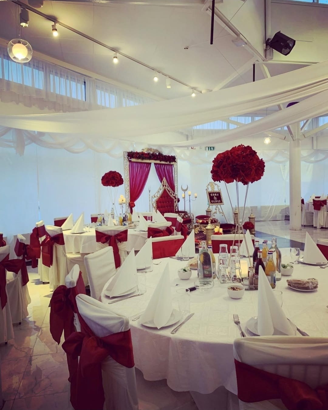 En pampig och elegant dukning i vitt och djupt vinrött skapar en exklusiv och stämningsfull atmosfär. De generösa stolsrosetterna, de höga blomsterarrangemangen och den vackert dekorerade scenen ger rummet en kunglig känsla där varje detalj andas lyx, tradition och fest.