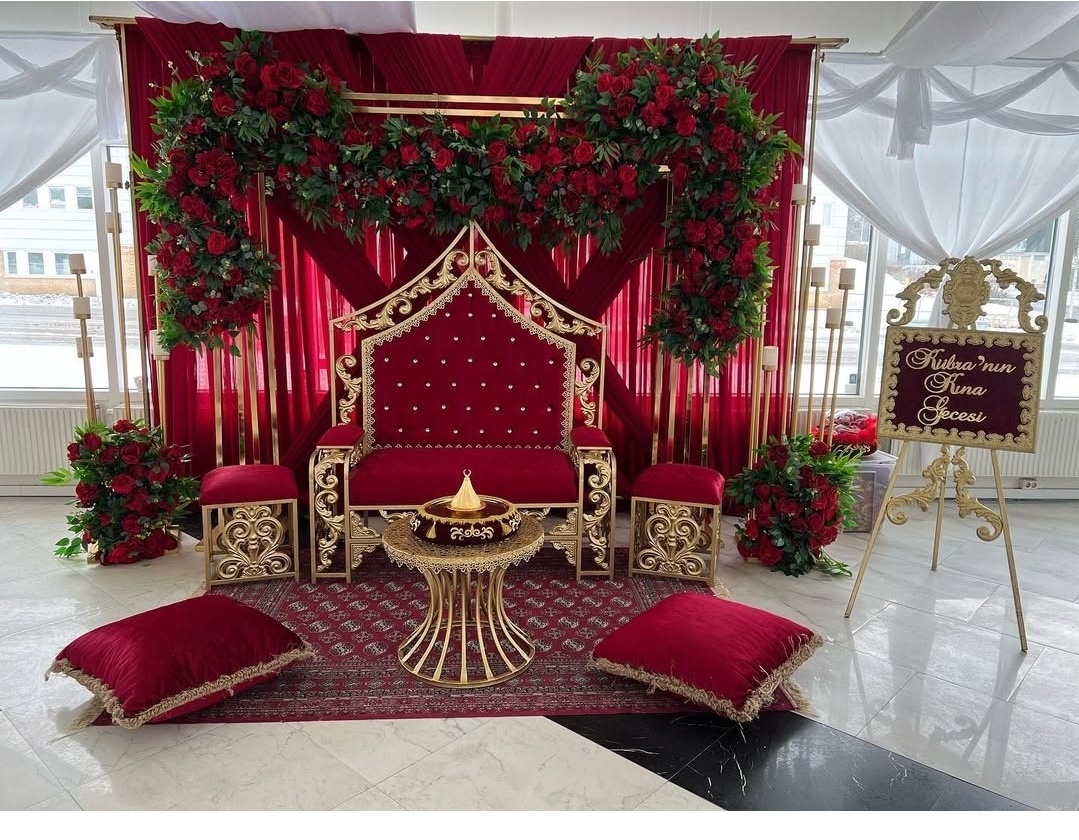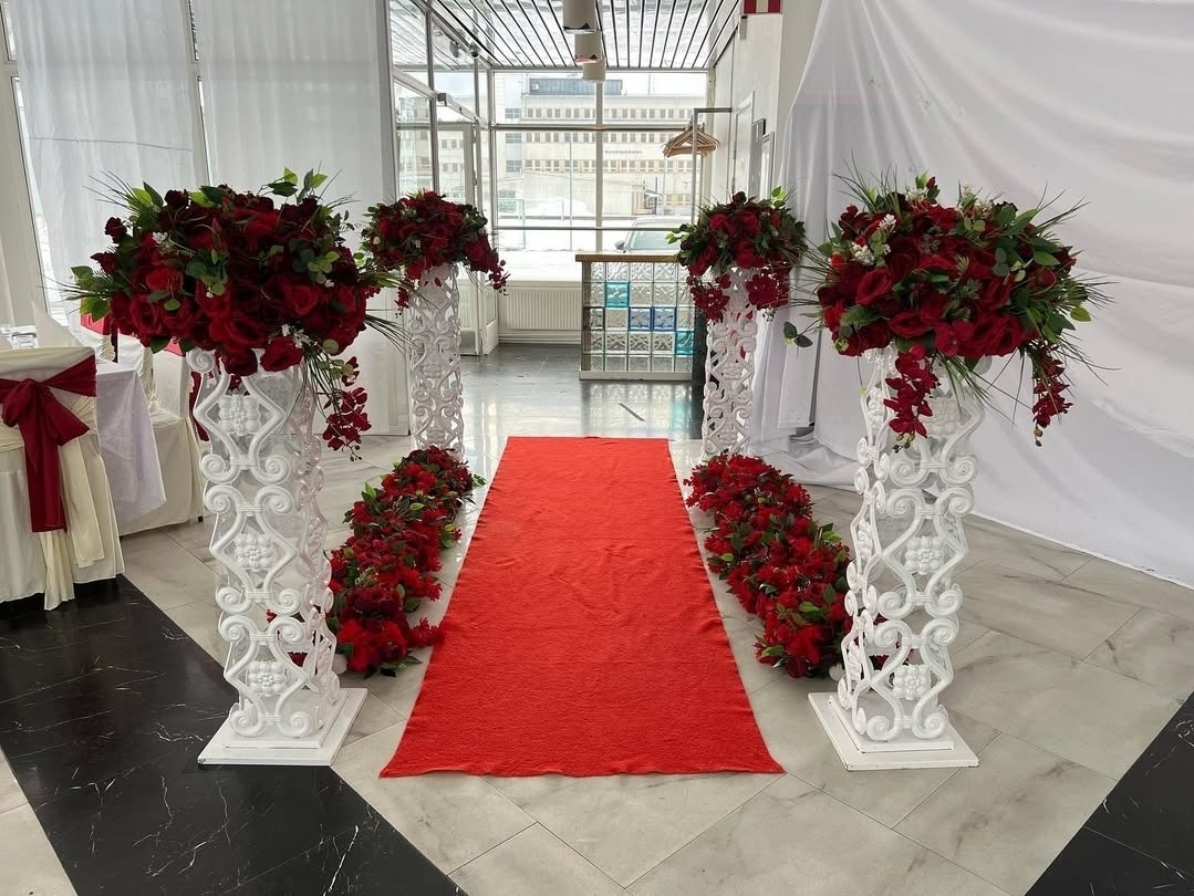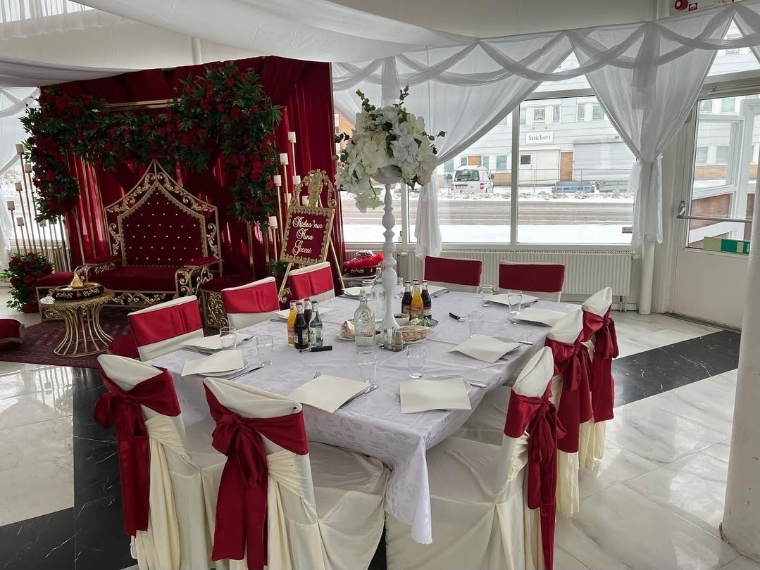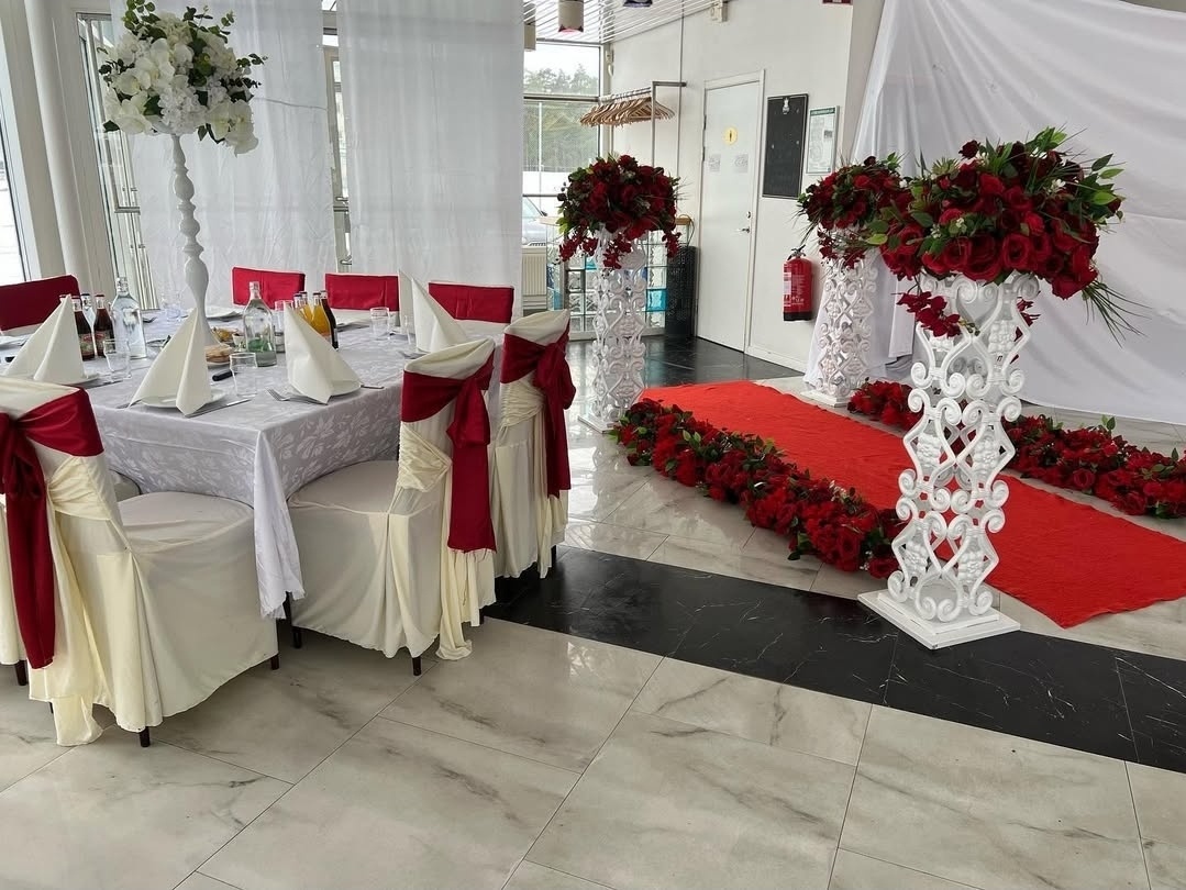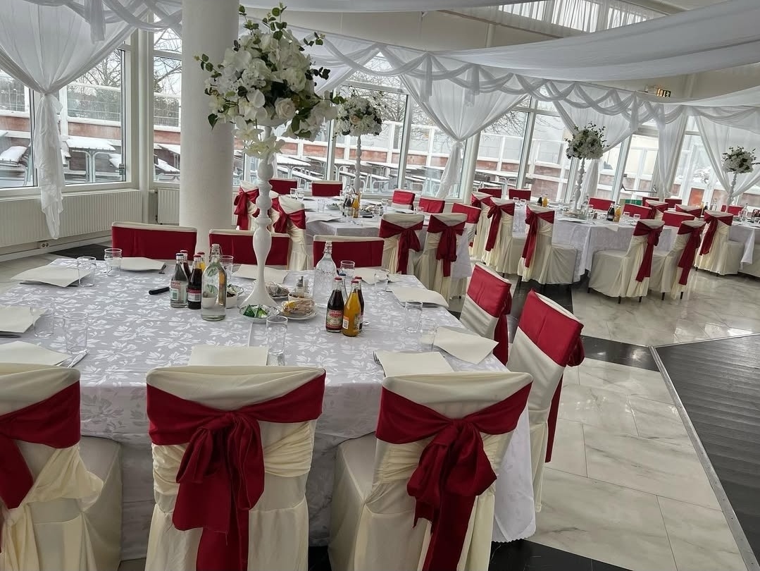 En stilfull och harmonisk dukning i vitt och vinrött skapar en exklusiv och inbjudande atmosfär. De vackert draperade stolarna med djupa rosetter, de höga blomsterarrangemangen och de mjuka tygdekorationerna i taket ger rummet en luftig och lyxig känsla – perfekt för ett högtidligt firande