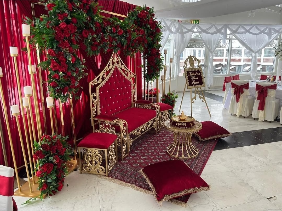 En lyxig hennadekoration i djupa röda toner och gyllene detaljer, där tradition möter modern elegans. Mjuka textilier, blommor och varm belysning skapar en stämningsfull och minnesvärd miljö.