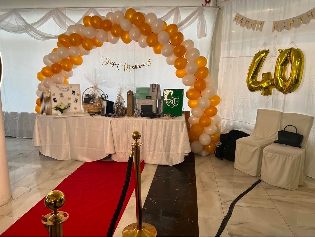 En sofistikerad dukning i vitt och guld skapar en exklusiv och festlig atmosfär. De stilrent vikta servetterna, mjuka stolsöverdragen och de guldvita ballongdekorationerna ger lokalen en luftig och elegant helhet som andas lyx och firande