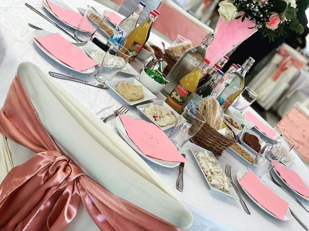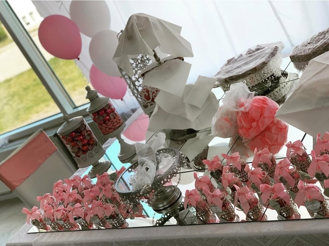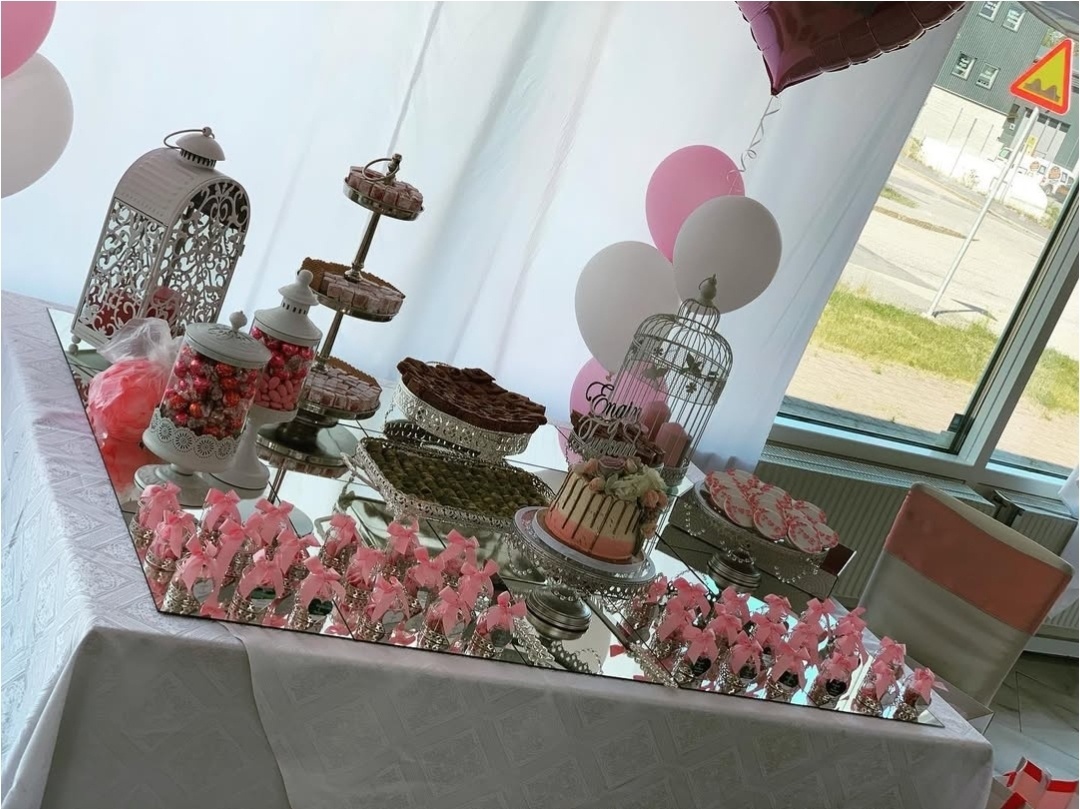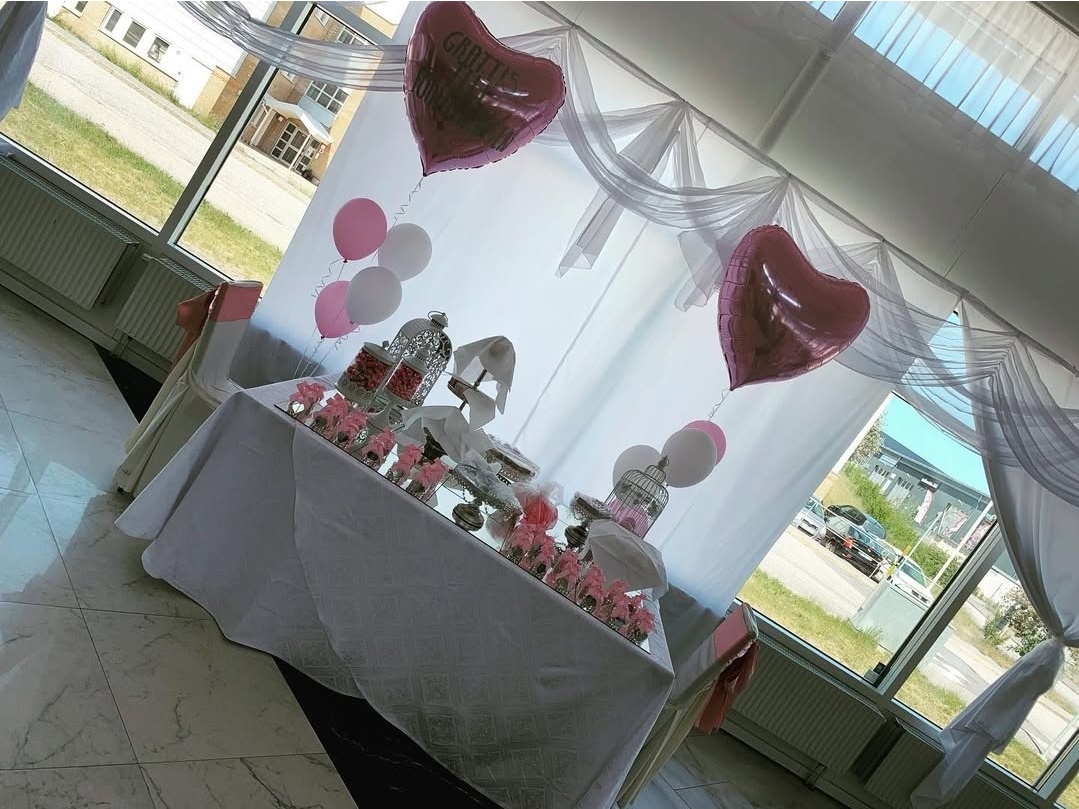 En elegant dukning i vitt och djupblå toner skapar en exklusiv och högtidlig atmosfär. De kraftiga blå stolsrosetterna, stilrena servetterna och de matchande ballongerna ger en sammanhållen helhet, medan den gulddetaljerade tronen tillför en kunglig känsla som gör firandet storslaget och minnesvärt.